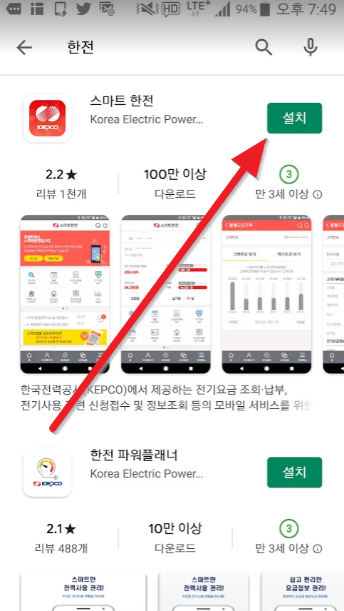갤럭시는 구글플레이에서, 아이폰은 앱스토어에서 "한전"을 검색합니다.