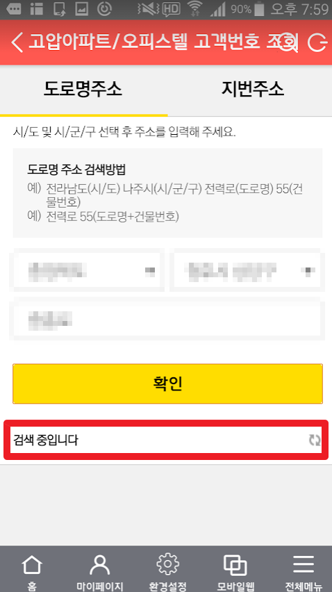 고객번호는 이제 메모해놓으시고요. 아래에 있는 아파트 동/호수를 0을 불여서 네자리로 입력합니다.