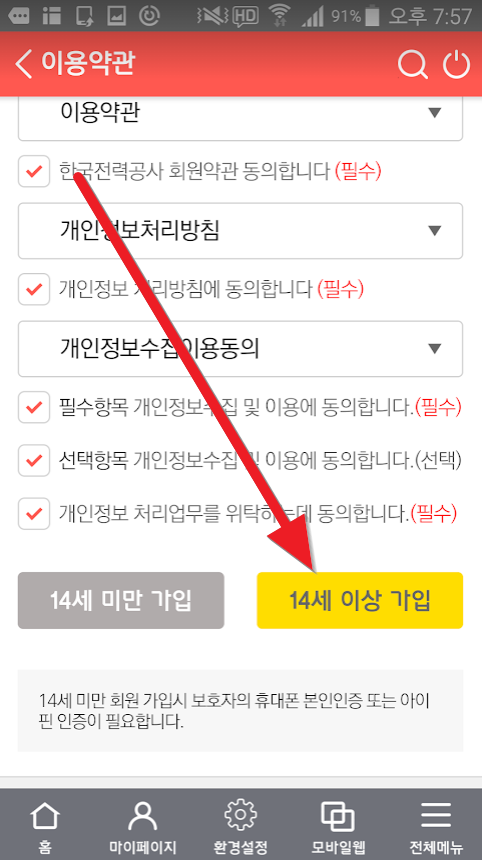 이제 14세 이상 가입을 터치합니다. (14세 미만 가입은 보호자 필요합니다.)
