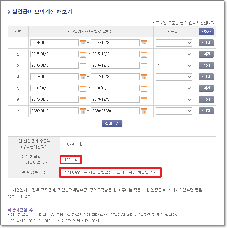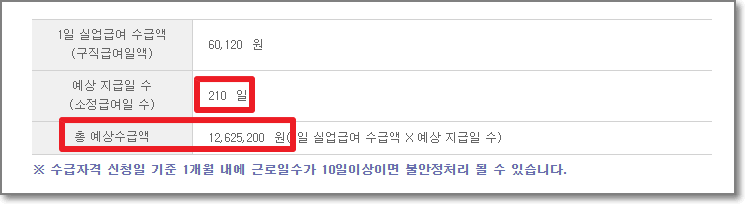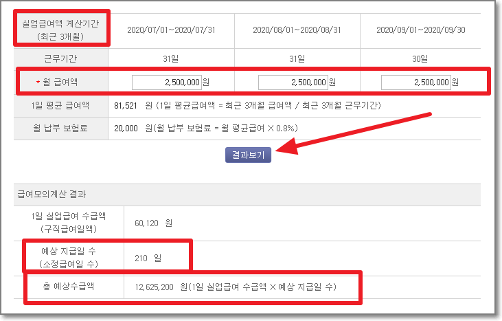 250만원으로 입력을 하고 "결과보기"를 눌러보니, 총 7개월동안 받을 수 있고 총 예상수급액은 1262만원정도 입니다.