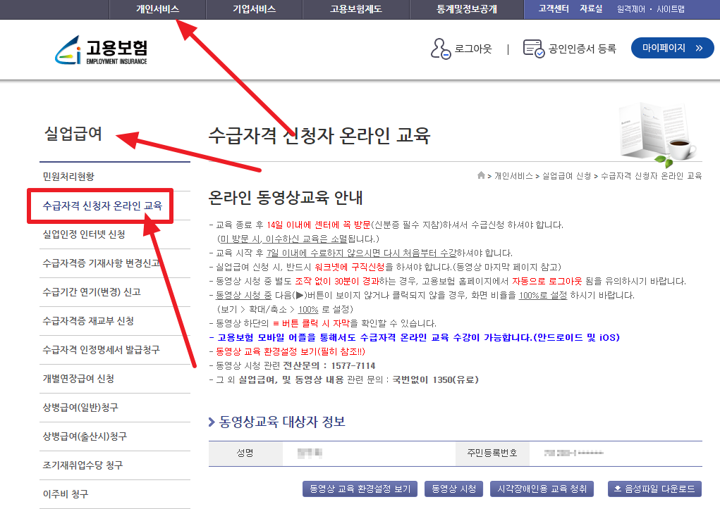 3. 수급자격 신청교육을 "고용보험홈페이지"에서 온라인으로 할 수 있습니다.(필수입니다.)