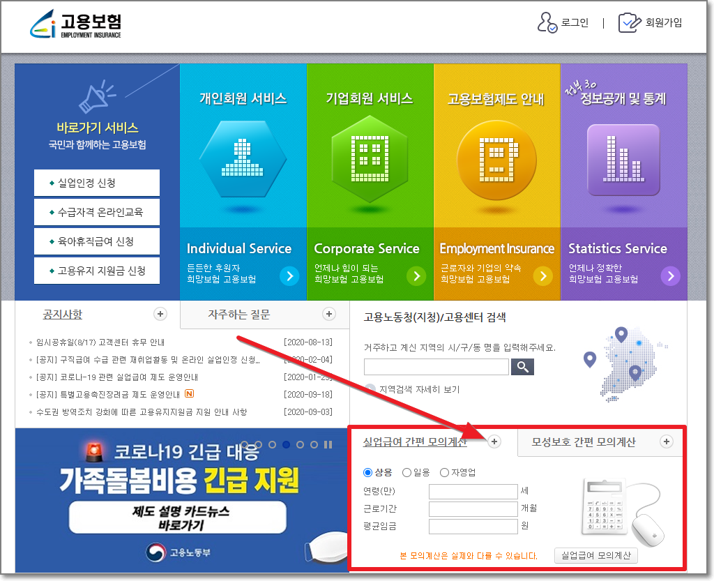 우선 링크한 고용보험 홈페이지를 클릭해서 여시고, 화살표친 "실업급여 간편 모의계산" 오른쪽 플러스를 누릅니다.