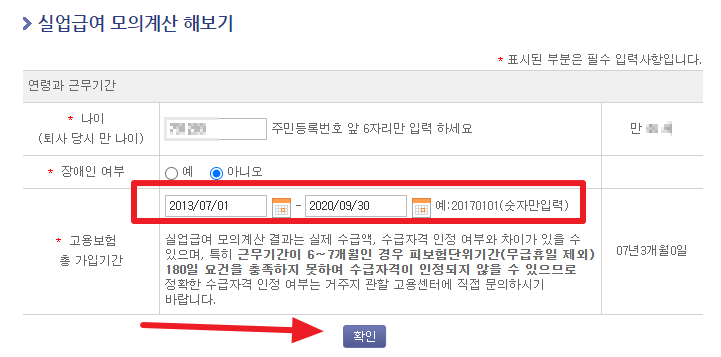 나이에는 주민번호 앞 6자리(즉 생년월일)를 입력하고, 고용보험 총가입기간에는 고용보험 가입날짜(취직날짜와 비슷합니다)와 퇴직날짜를 입력하고 확인을 누르면 총 가입기간이 나오게 됩니다.