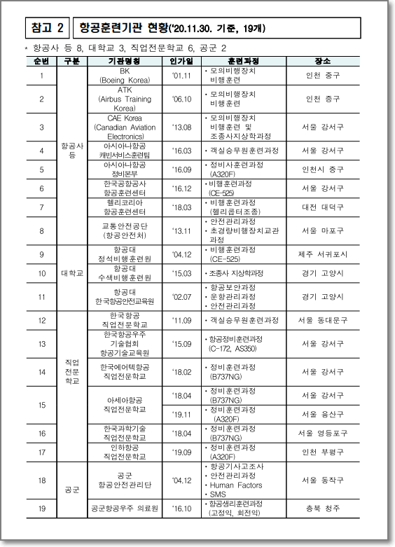 항공종사자 양성 전문교육기관 현황(2020.11.30일 기준)