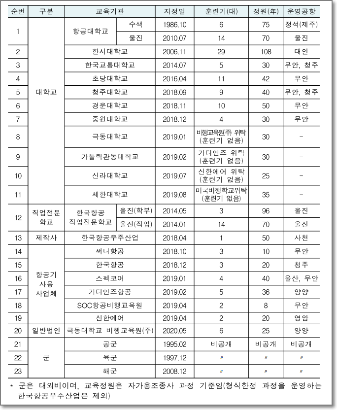 * 극동대학교는 '극동대학교 비행교육원(주)'로 위탁교육