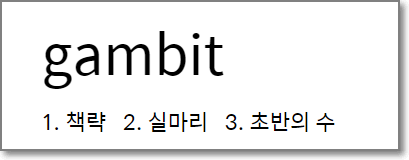 Gambit은 초반의 수 라는 영어 단어이며 "기선을 제압하려고 두는 초반의 수"라는 뜻이 있습니다.