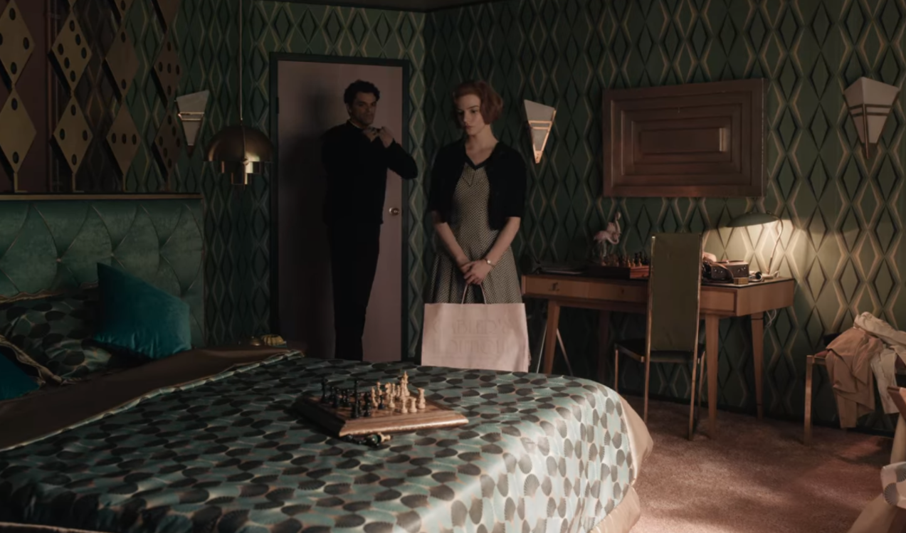오랜만에 베스를 만난 타운스는 베스를 자기가 사는 방으로 초대하는 장면이 나오는데 그 장면에서 방에 침대는 체스판이 올려진 저 침대 1개 뿐입니다. 그리고 나서....