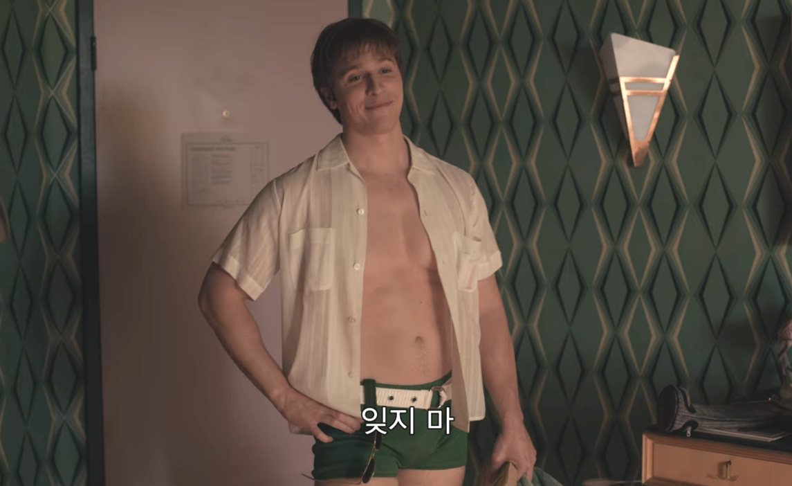룸메이트 로저가 들어옵니다. 일단 드라마적 연출은 모두 계산된 것이니 하나하나 보면, 우선 로저의 티셔츠는 몸매가 잘 드러나게 착 붙은 셔츠입니다. 그리고 앞가슴 단추를 다소 과하게 풀었죠. 그리고 중요한건 표정... 아마도 모두 계산된 연출일 것입니다.