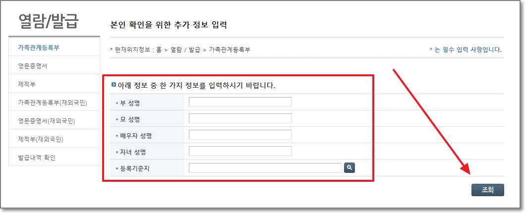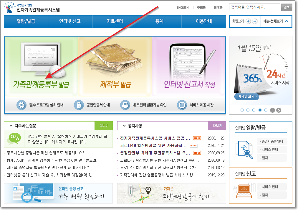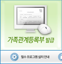 첫화면에서 화살표친 "가족관계등록부 발급"에 마우스를 가져다 댑니다.
