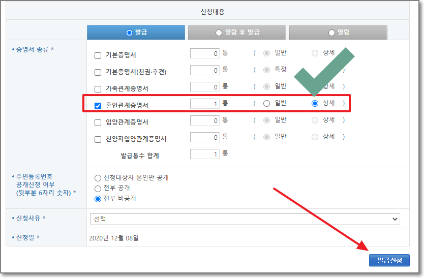 아까 진행하던 화면에서 신청내용에 혼인관계증명서의 일반과 상세 중에서 "상세"로 체크를 하고 "발급신청"을 합니다.