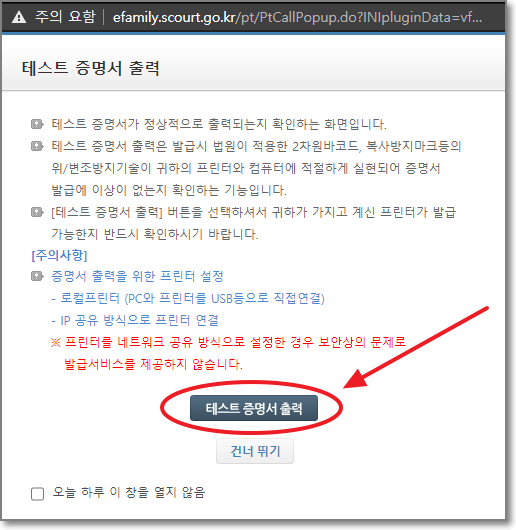 새창이 하나 뜨면서 "테스트 증명서 출력"이라는 내용이 나옵니다.