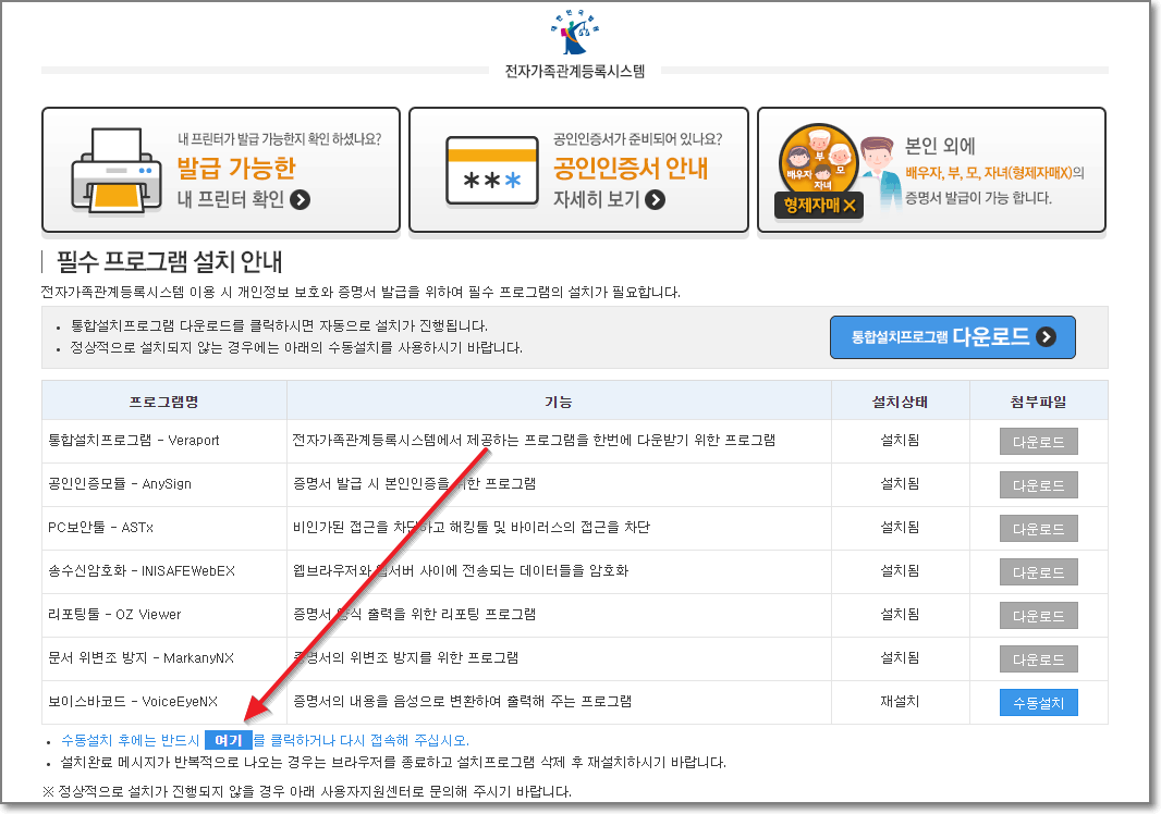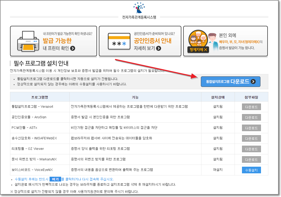 링크를 누르면 아래와 같이 열릴텐데요. 화살표가 가리키는 "통합설치프로그램 다운로드"를 눌러서 필요한 파일들을 설치합니다.