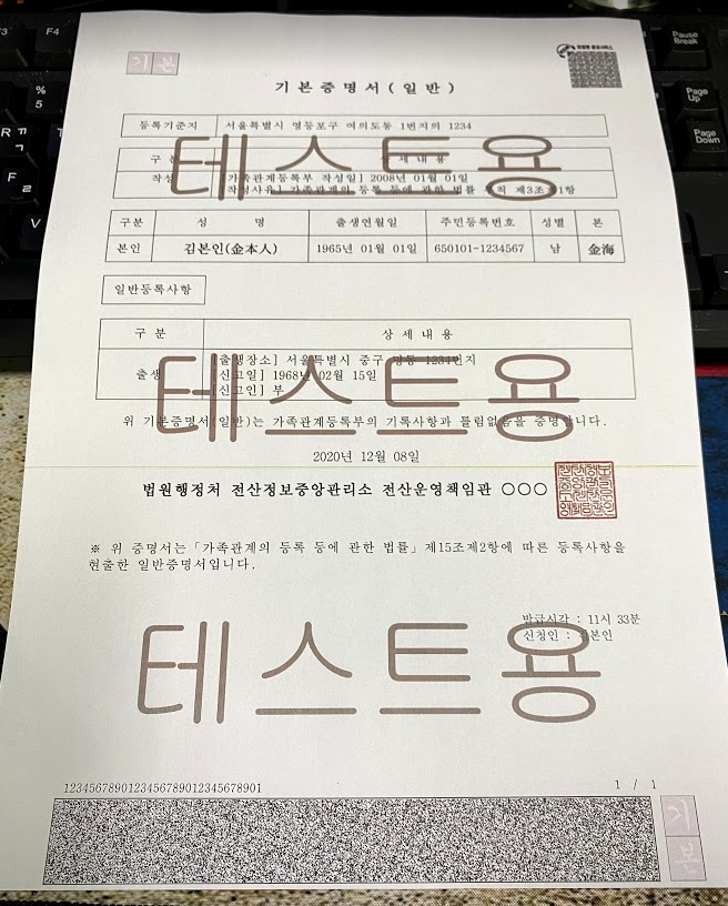 테스트용이 1965년생 김본인님의 기본증명서로 출력이 되었습니다.
