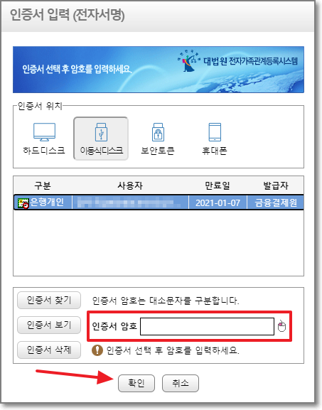 공인인증서 선택하고 인증서 암호 입력후에 "확인"을 누릅니다.