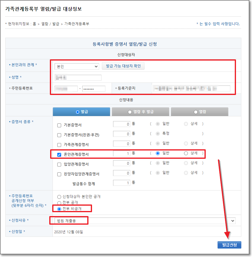 혼인관계증명서에 체크를 하고 주민등록번호는 전부비공개로 한후에 신청사유를 법원제출용으로 선택하고 "발급신청"을 누릅니다.