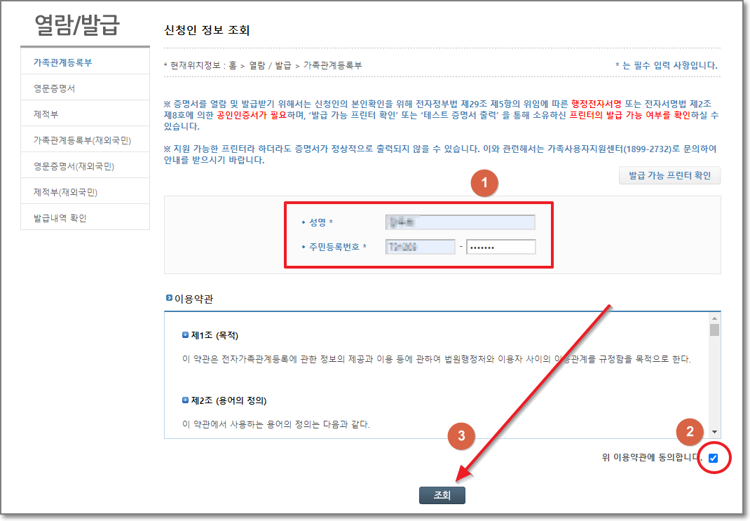 이제 성명과 주민등록번호 입력하고 약관에 동의한 후에 "조회"를 누릅니다.