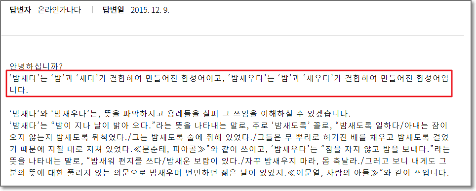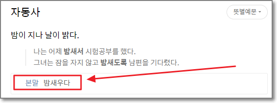 그런데 화살표를 보시면 중요한 말이 있습니다. 바로 원래의 본말은 "밤새우다" 입니다.