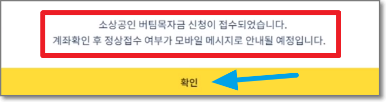 신청이 완료되었습니다. 계좌가 정상인지(살아있는지) 확인하고 정상접수 여부가 문자로 안내될 예정이라고 나옵니다. 확인을 누릅니다.