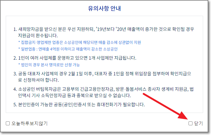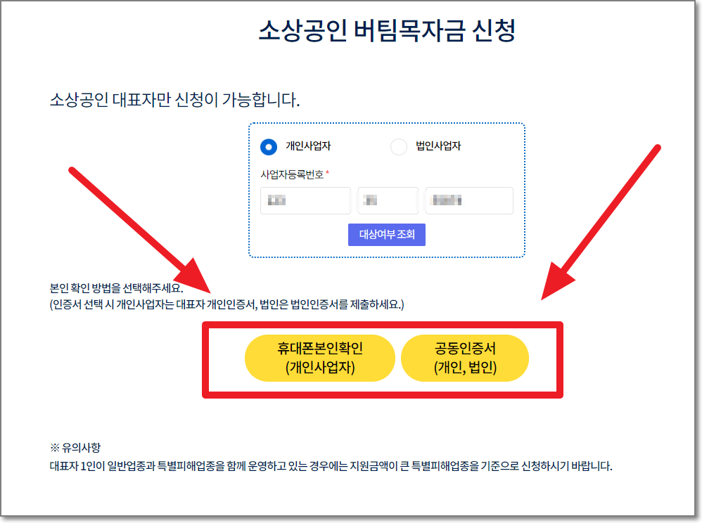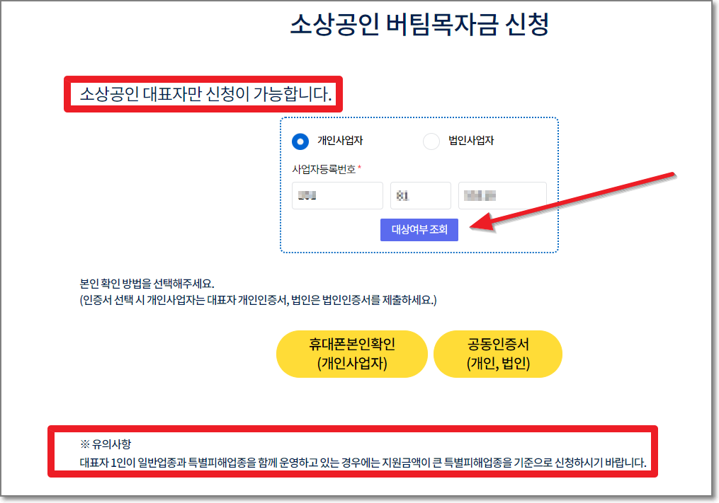 ※ 소상공인 대표자만 신청이 가능하며, 사업체를 여러개 운영하고 있을 경우 지원금액이 큰 업종을 기준으로 신청해야 합니다.