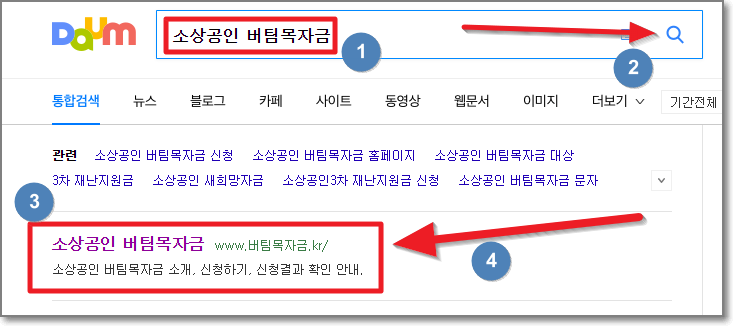 위와 같은 소상공인 버팀목자금 안내 문자가 휴대폰으로 왔을 것입니다. DAUM홈페이지로 접속해서 검색창에 "소상공인 버팀목자금"이라고 쓰고 오른쪽에 돋보기를 누릅니다.