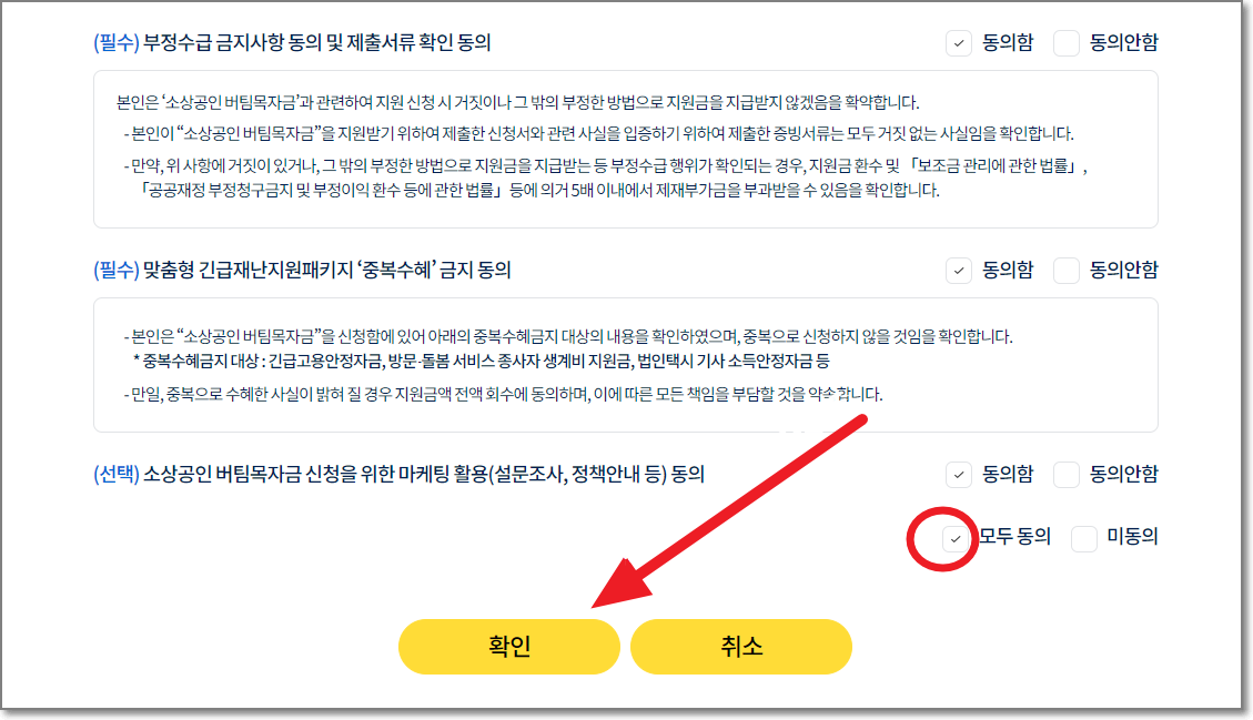 맨 아래에 있는 "모두동의"를 체크하시고 빨간화살표가 가리키는 것처럼 "확인"을 누릅니다.