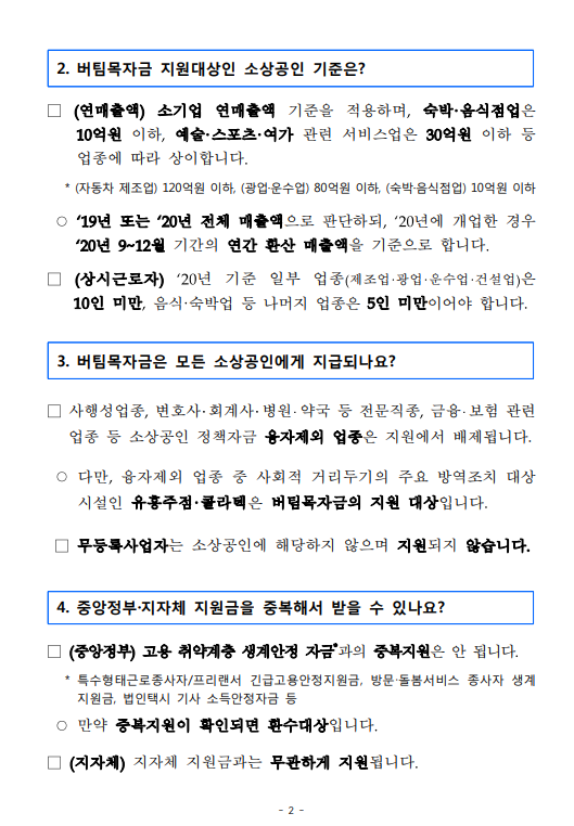 * 소상공인 : 매출액 10~120억원 이하(음식·숙박 : 10, 도소매 : 50, 제조 120 등)이고, 상시근로자가 5~10인 미만(음식·숙박 : 5, 도소매 : 5, 제조·운수 : 10 등)