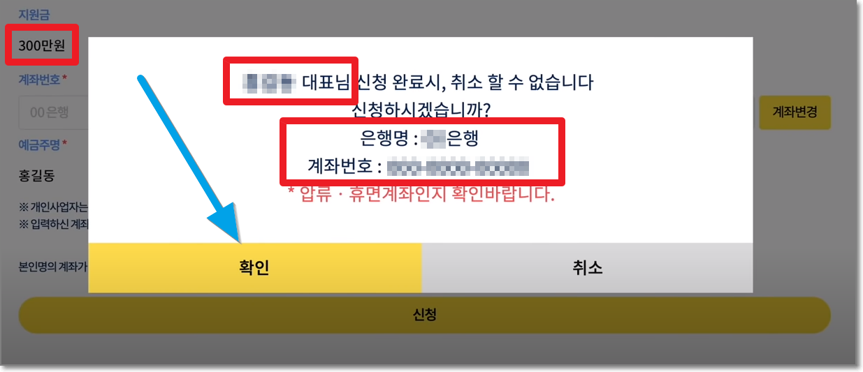 다음에 나오는 마지막 화면에서 "신청자명", "은행계좌번호", "지원금"을 체크하시고 "확인"을 누릅니다.