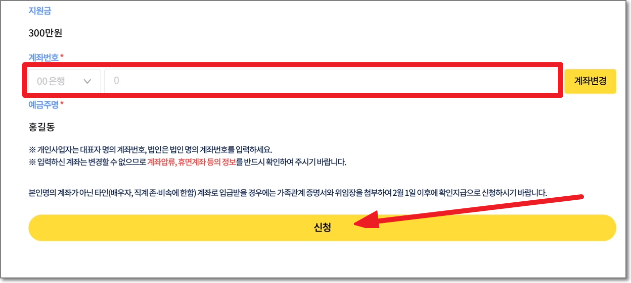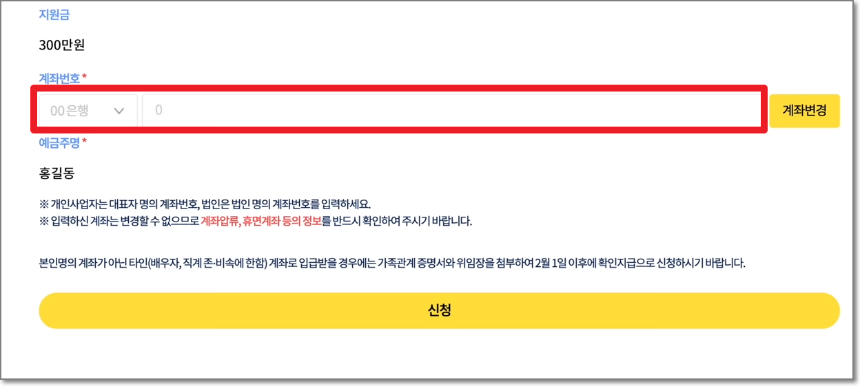 새희망자금을 받은 이력이 있으시다면 계좌번호는 자동으로 뜹니다. 만약에 압류 또는 휴면계좌 등의 이유로 계좌번호 변경이 필요하다면 "계좌변경"버튼을 눌러서 새로운 계좌번호를 써 넣으시면 됩니다.