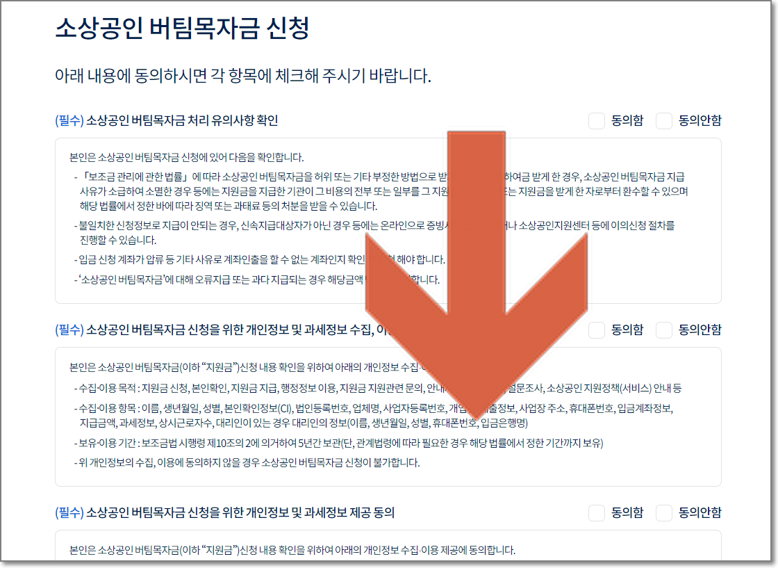 그러면 아래처럼 소상공인 버팀목자금 신청관련 개인정보 동의 등의 내용이 나오는데, 밑으로 내려서 맨 아래로 갑니다.