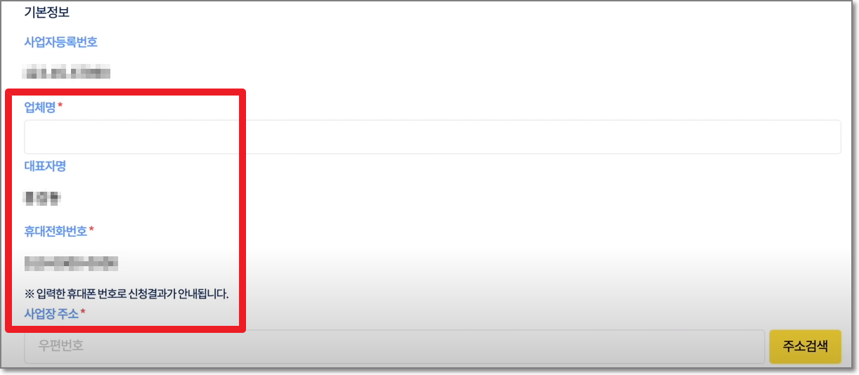 사업자번호를 넣었기 때문에 업체정보가 자동으로 나오게 됩니다. 업체명과 대표자명 그리고 핸드폰번호와 사업장 주소가 제대로 되어있는지 확인하면서 화면을 내립니다. 이때 사업장 주소가 사업자등록증과 다르면 수정하실 수 있습니다.