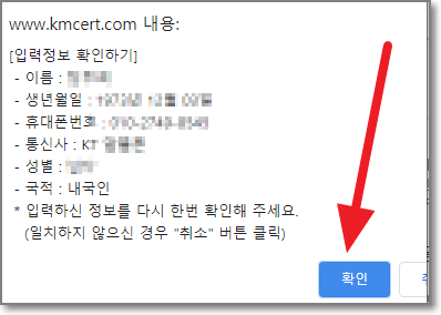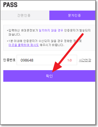 위와 같은 문자가 옵니다. 아래와 같은 화면에 입력을 해주고 확인을 누릅니다.