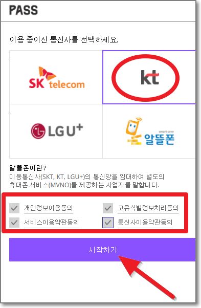 이용중인 통신사를 선택하고 아래있는 네군데 모두 동의한다음에 "시작하기"를 누릅니다.