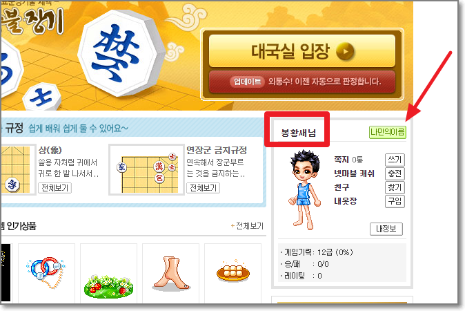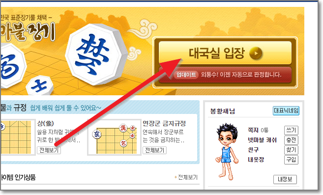 그래서 아까 닉네임 지을 때 심사숙고하라는 것이었습니다. 다시 처음으로 돌아와서 보면 이제 장기를 두려면 어떻게 해야 할까요? "대국실 입장"을 누르시면 됩니다. 조금만 더 따라오세요. 이제 얼마 안남았습니다.