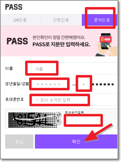 맨위에 "문자인증"을 누르고, 이름과 생년월일 그리고 주민번호 뒷자리의 첫번째 숫자만 적고 휴대폰번호를 적습니다. 그리고 보안숫자는 왼쪽에 보이는 대로 입력을 하고 "확인"을 누릅니다.