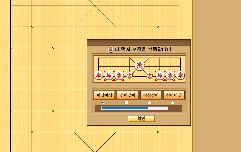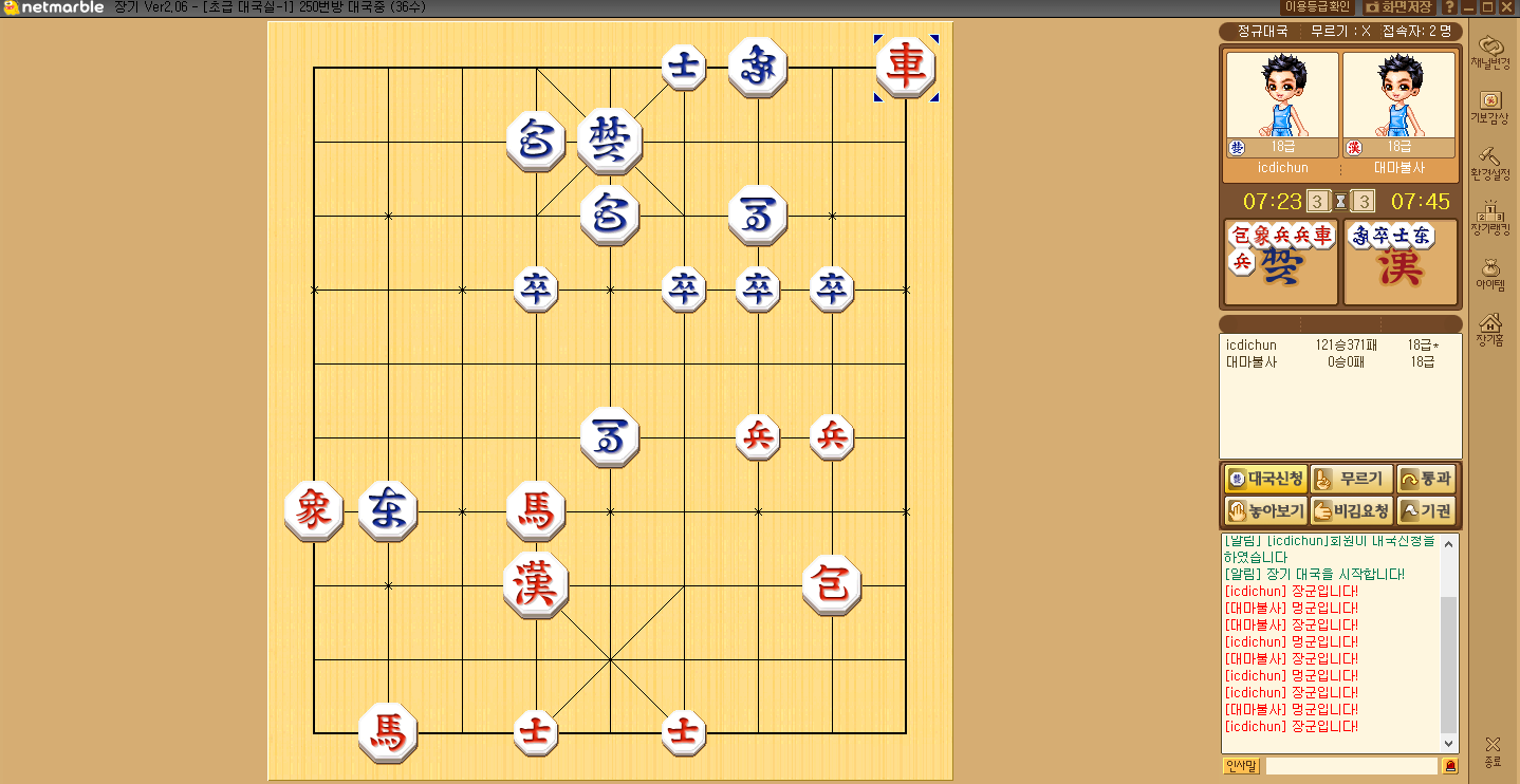 아래처럼 대국실에 있다가 초대에 응하면 실제로 대국을 하게 됩니다. 재미있는 장기생활 하시기 바랍니다.