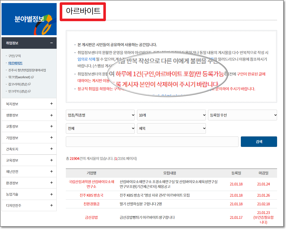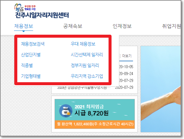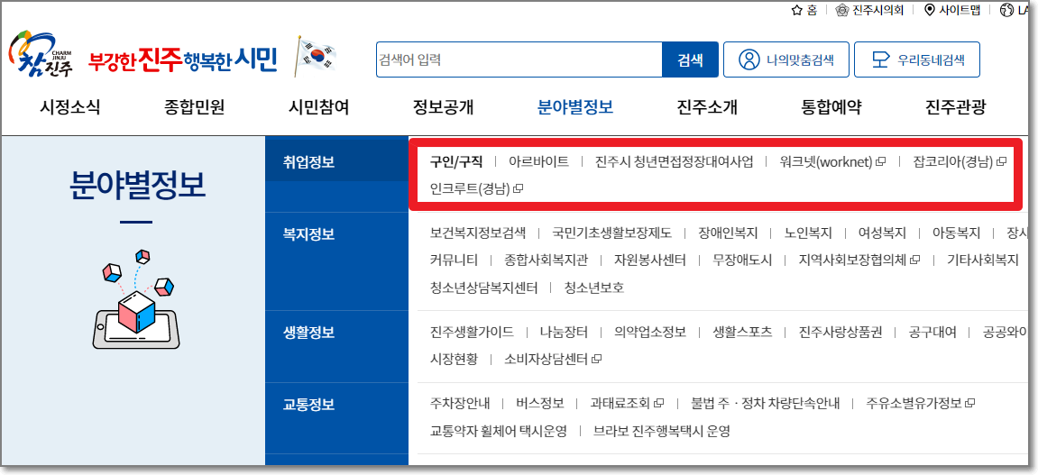 - 진주시청 홈페이지에 들어가면 구인/구직 카테고리에 아르바이트부터 정규직까지 알아볼 수 있습니다.