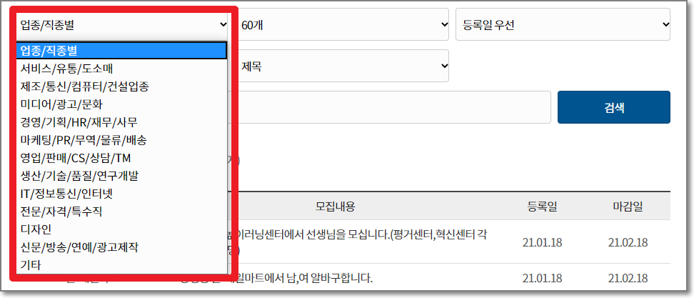 원하는 것을 검색을 해보시려면 아래처럼 "업종/직종별"을 선택하시면 원하는 일자리를 구하실 수가 있습니다.