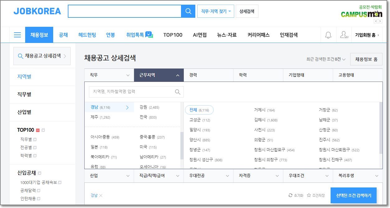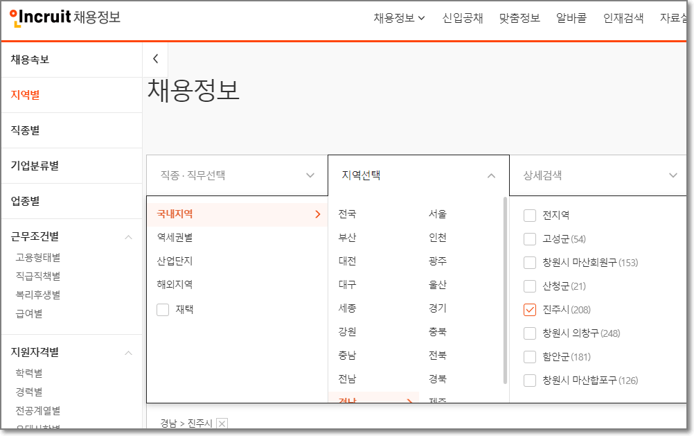 - 워크넷,인크루트,잡코리아 등도 경남 진주지역으로 설정해놓아서 편리하게 검색할 수 있습니다.