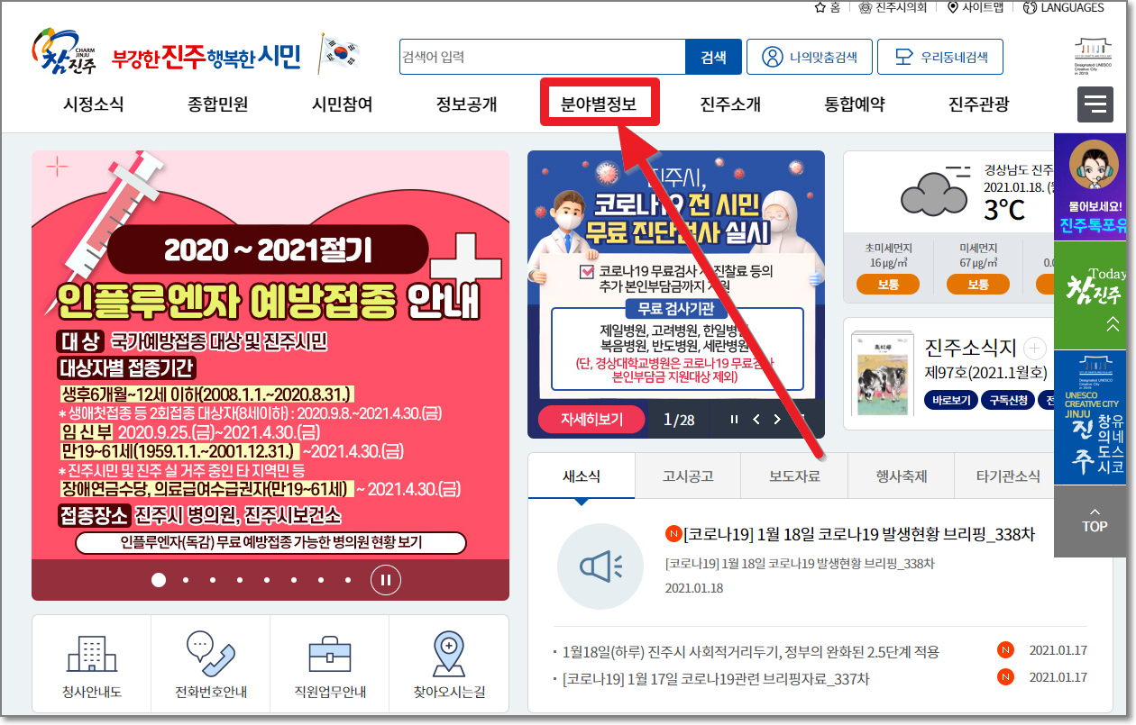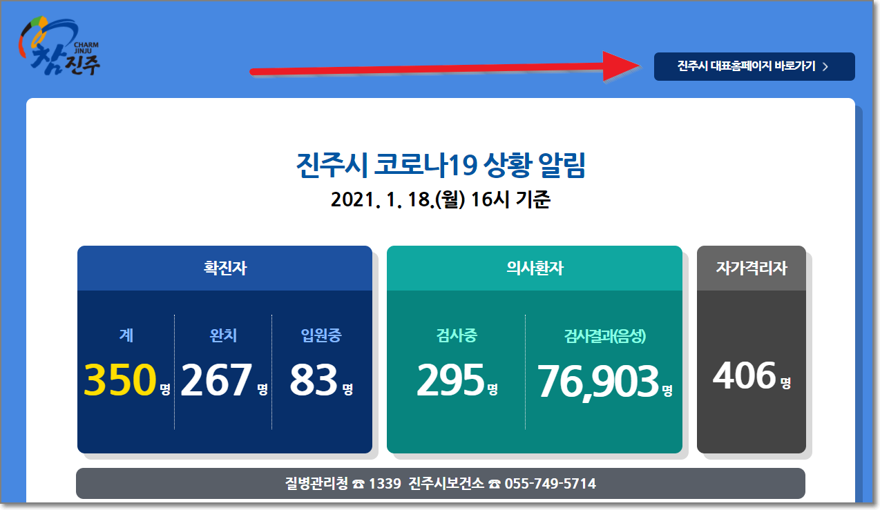 우선 진주시청 홈페이지로 들어가야겠죠? 제가 진주시청 글씨에 링크를 걸어놓았으니 그리로 들어가시면 되고요. 처음에 들어가면 아래처럼 코로나19상황 알림이 나와요.그러면 "진주시 대표홈페이지 바로가기"를 누르시고 들어가면 됩니다.