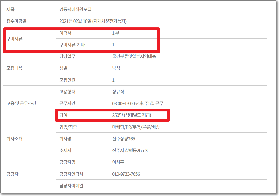 상세페이지를 눌러보면 구비서류는 무엇이 필요한지, 고용 및 근무조건은 어떻고 급여는 얼마인지가 나와있습니다.