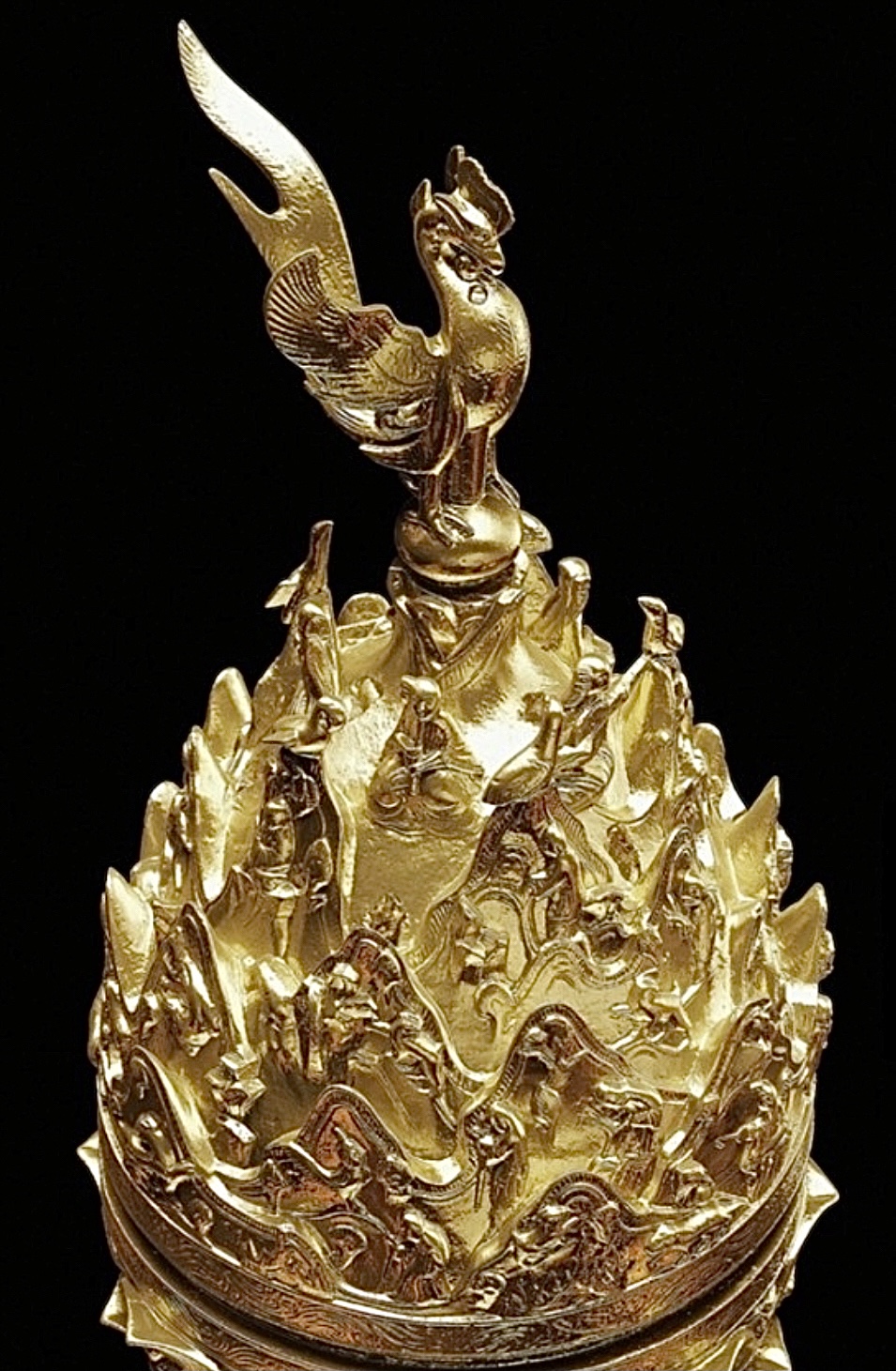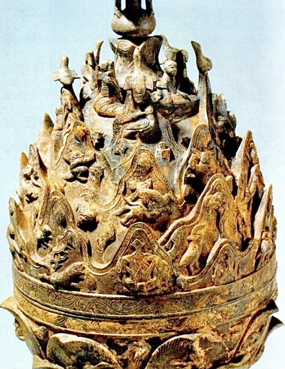 뚜껑에는 23개의 산들이 4~5겹으로 첩첩산중을 이루는 풍경을 보여주고 있으며 피리와 소비파, 현금, 북들을 연주하는 5인의 악사와 각종 무인상, 기마수렵상 등 16인의 인물상과 봉황, 용을 비롯한 상상의 날짐승, 호랑이, 사슴 등 39마리의 현실 세계 동물들이 표현되어 있습니다. 이 밖에 6개의 나무와 12개의 바위, 산 중턱에 있는 산길, 산 사이로 흐르는 시냇물, 폭포, 호수 등이 변화무쌍하게 표현되어 있는 정교한 예술작품이었습니다.