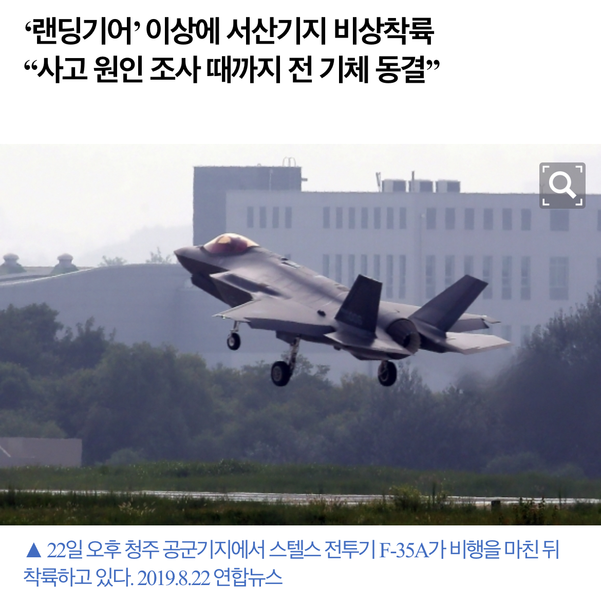 ‘랜딩기어’ 이상에 서산기지 비상착륙 “사고 원인 조사 때까지 전 기체 동결”, 우리 공군이 보유한 최신예 스텔스 전투기 F-35A 1대가 4일 훈련 비행 중 기체 이상으로 비상 착륙했다. 조종사